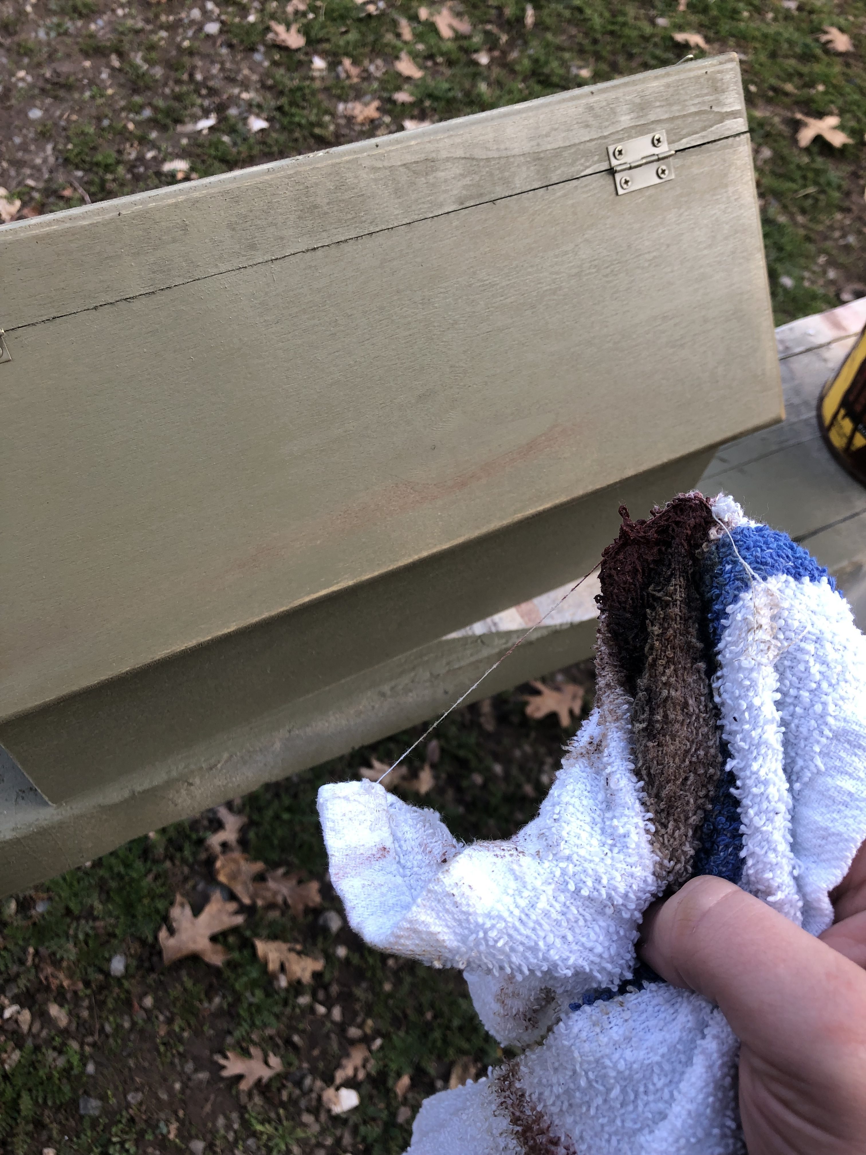 Step 2: Dip your rag into just a bit and wipe over where you want it. Working quickly, wipe a clean part of the cloth over where you’ve stained to wipe off excess. Subtlety is the key here.