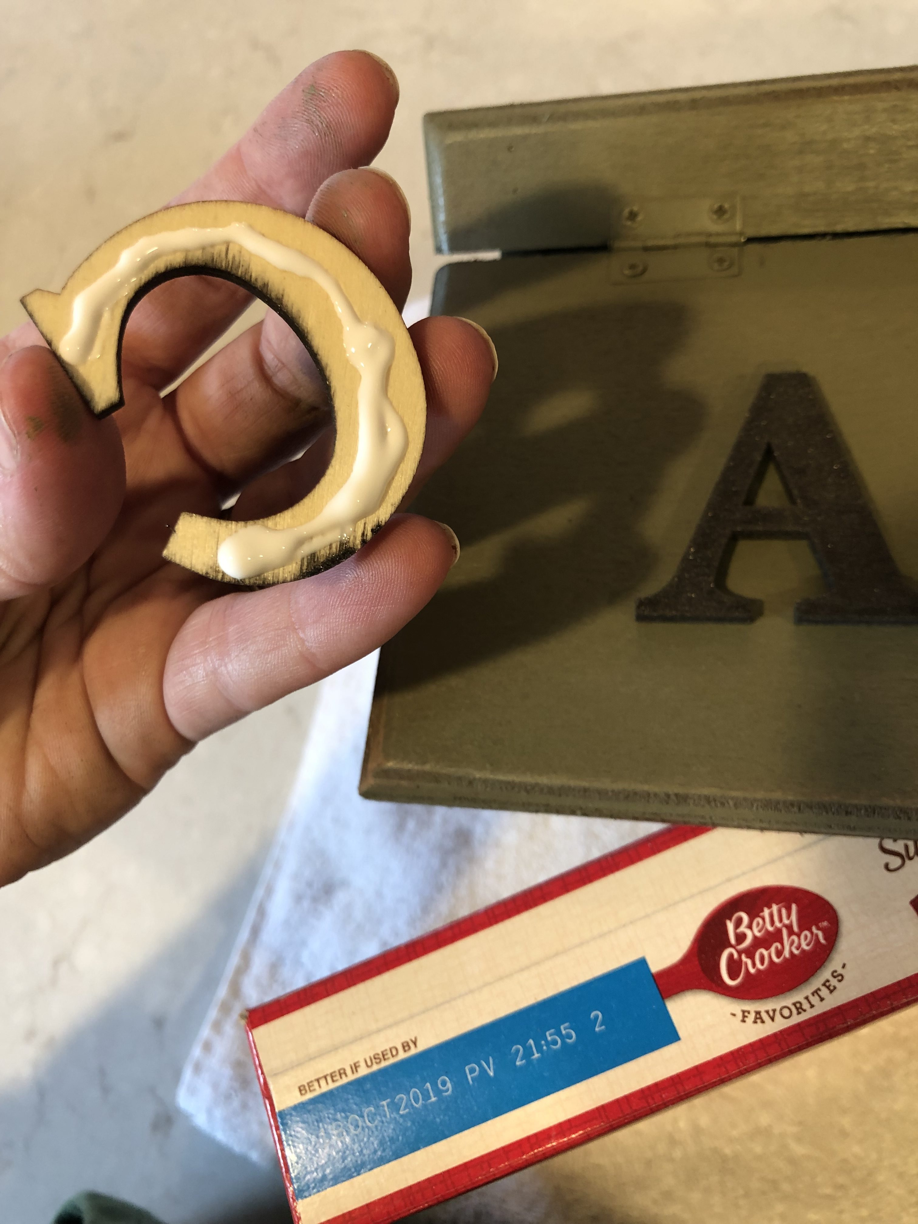 Because of the slope of this particular mailbox, you’ll need to find some sort of support for the flap while the glue on your letters dries. We found a boxed cake mix to be superb for this purpose!