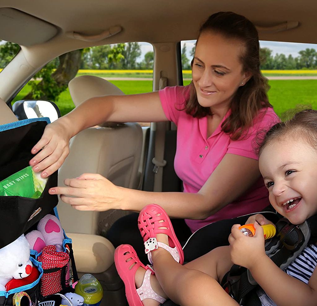 Instead of a parent reaching all over to give children snacks and items in a car, it’s way better if the children know where everything is and can help themselves. That’s why these back-seat car organizers are smart choices for parents.