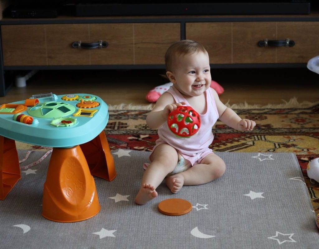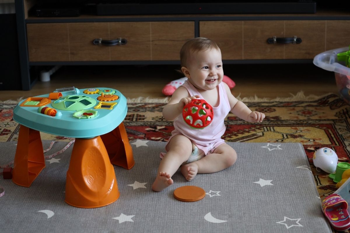 Some activity tables are only made for toddlers who are confidently standing, so make sure if your baby is just learning to stand that you get a table with a wide base so that it won’t fall onto your baby if they pull to stand with it. Pay attention to suggested age limits, product descriptions, and reviews to see if the table you’re considering is appropriate for your child’s physical development level. If they’re still very little, it might be time for their first playmat instead.