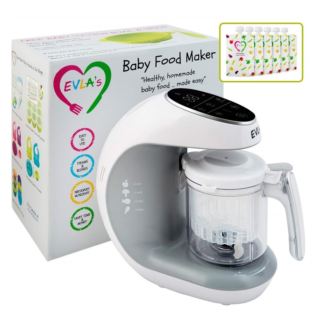 The award-winning EVLA’S Baby Food Processor includes six storage pouches to easily put away the baby food you make with it. It even sterilizes itself for simple cleanup. To remove stubborn stains, its stirring cup can even be placed in the dishwasher. Lock in flavor and freshness by steaming foods with this baby food processor.