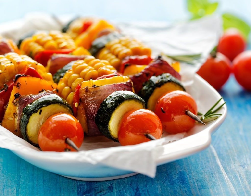 - Grilled marinated summer squash, peppers, corn, and cherry tomatoes