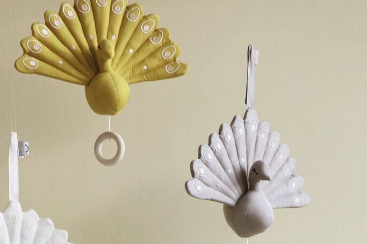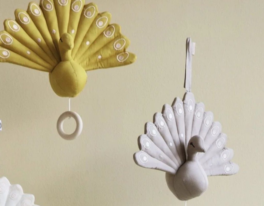 Mobiles are practical for entertaining and calming your baby but also add a pop of style above the crib or changing table. This peacock mobile is hand-crafted from 100% certified organic cotton with white embroidery accents. Pull the small wooden ring to play a sweet lullaby tune. The beautiful neutral colors and pretty animal choice will bring a comforting element into your baby’s safe haven.