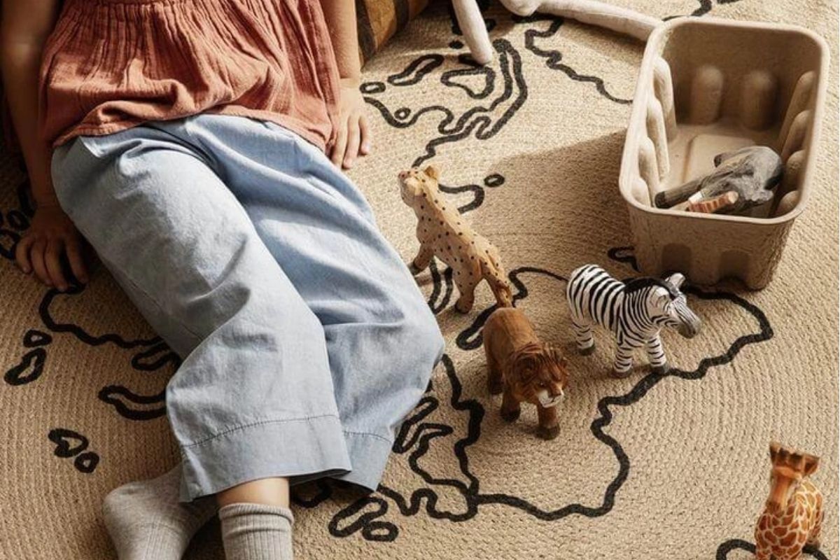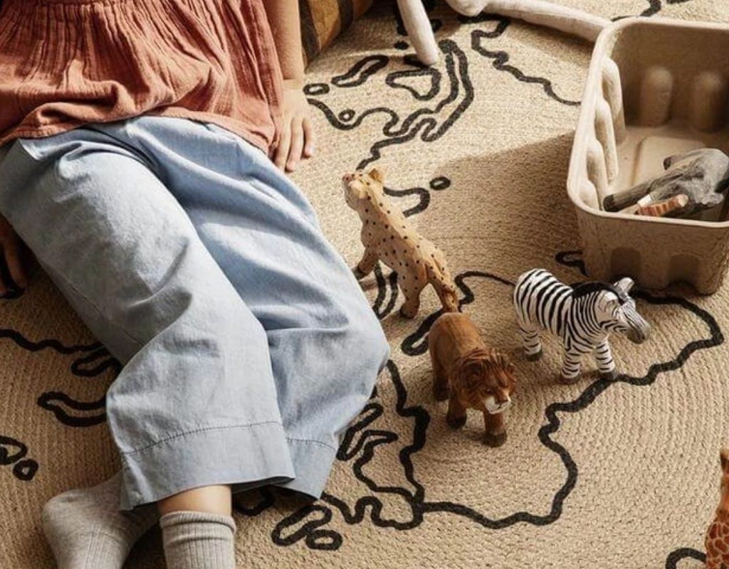 An area carpet can tie a whole room together, and this world map printed on 100% natural jute brings in earth tones that can connect to many different themes. Jute is a sustainable, durable material that works well as a play mat and is safe to vacuum. This woven carpet is available in small or large sizes to fit your nursery’s dimensions.