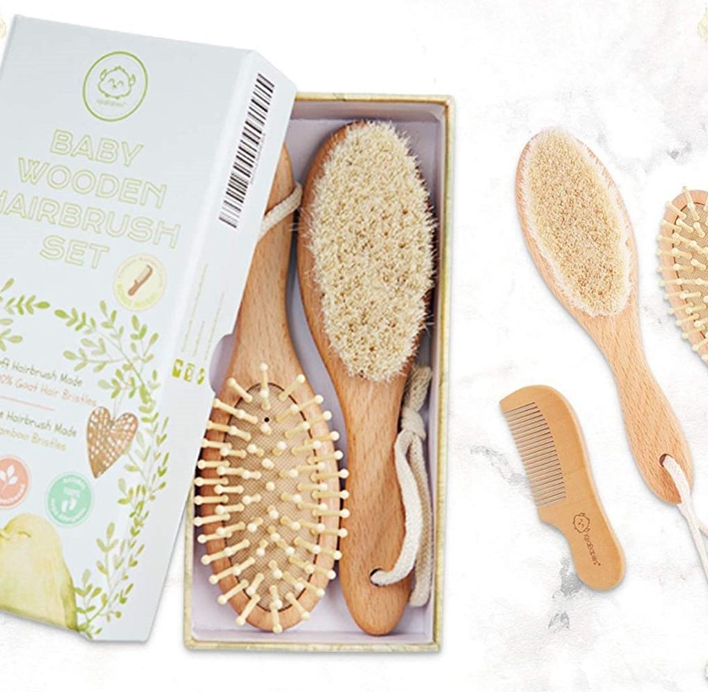 The three-piece KeaBabies Baby Hair Brush and Comb Set for Newborn features grooming items that each have a different surface for versatility. One beech-handled hairbrush with goat-hair bristles, a brush with bamboo massage bristles, and an all-beech comb comprise this set. The two hairbrushes feature cotton strings so that they can be hung. The brushes of the Baby Hair Brush and Comb Set for Newborns are suitable for wet or dry hair. Promote healthy blood circulation and protect your baby’s soft spot with this hair set.