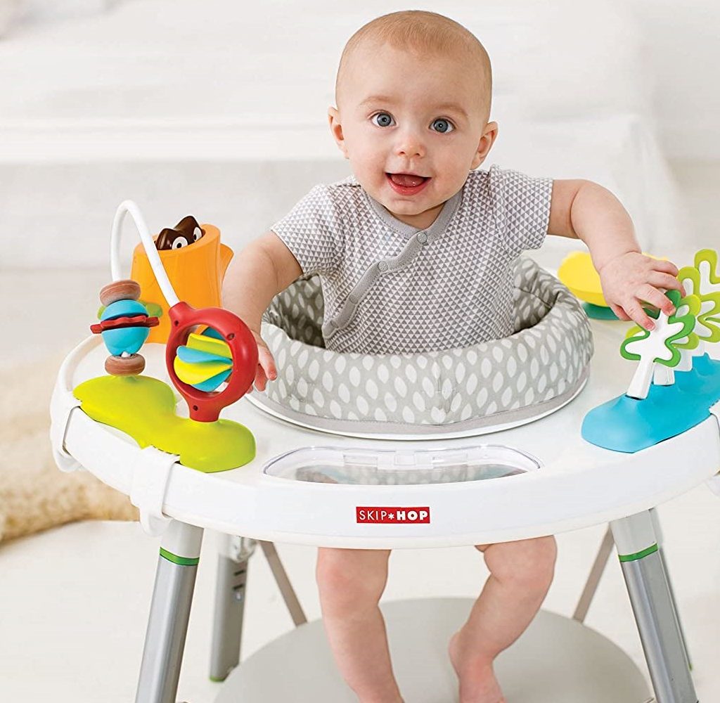 This fun and inviting Skip Hop Explore 3-Stage Interactive Activity Center is the perfect baby activity jumper that is full of fun things to do. The activity center takes a whole-body approach so that your toddler can get all of the movements and developments in their daily routine. There are four movable toys that include 25 developmental activities. As the baby grows, the center converts from a bouncer to a sturdy table so they can use it as a coloring and play space.