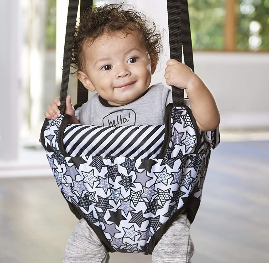 The Evenflo Doorway Jumper is a great baby activity jumper for your little one. The jumping helps your baby develop core muscles and provides entertainment for hours without taking up a lot of space or using up a lot of toys. The adjustable straps can let you customize the height of the bouncer. Take it apart for an easy cleanup in case of any accidents during playtime.