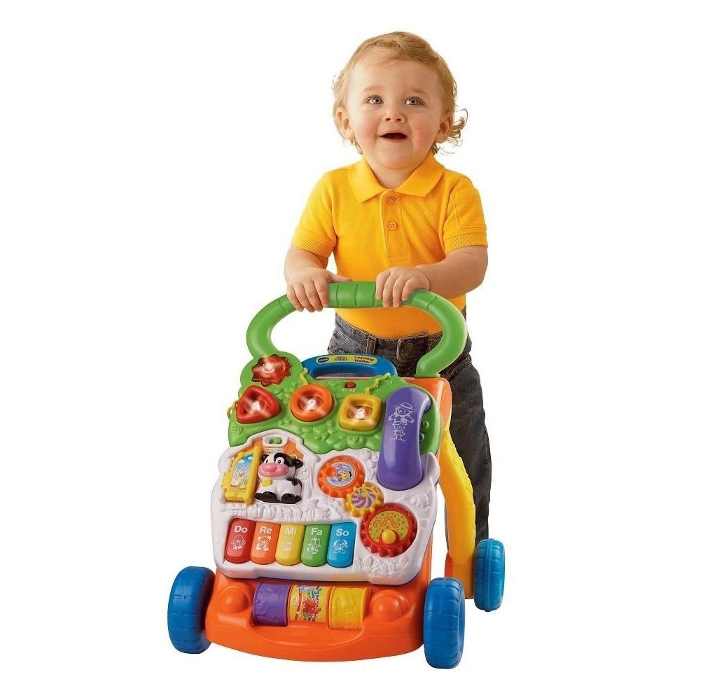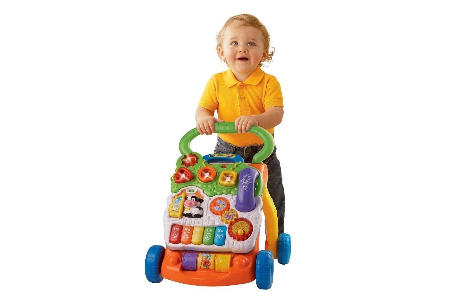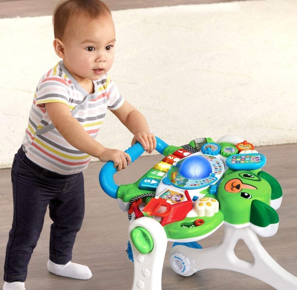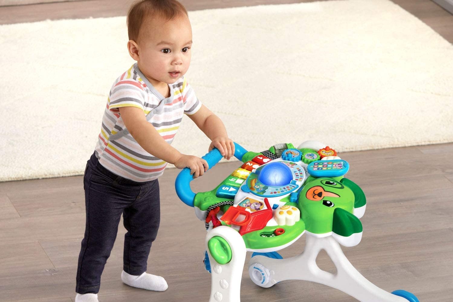 The VTech Sit-to-Stand Learning Walker is a convertible activity tray and walker. Its interactive musical panel can lie flat on the floor for babies who can sit up, and then clips into a rolling frame for those learning to walk.