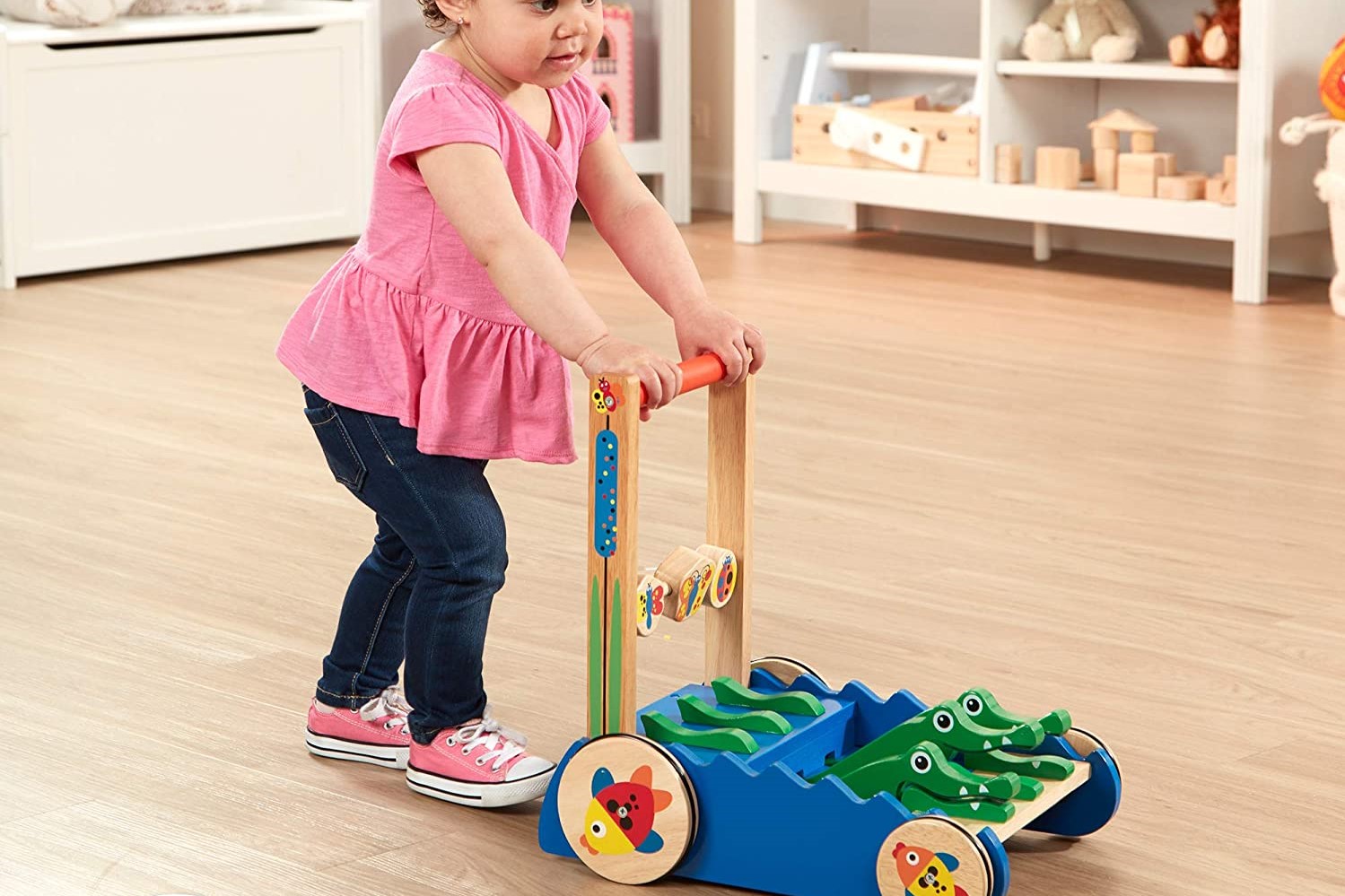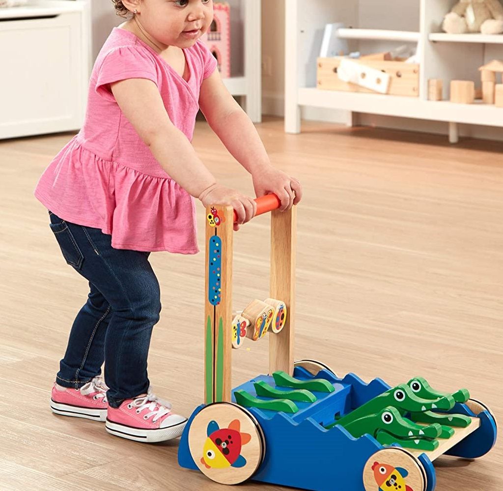 The sturdy wooden construction of the Melissa & Doug Chomp & Clack Alligator Push Toy makes it a push walker that will last for many years. It can even withstand rugged use by multiple children while providing hours of screen-free fun.