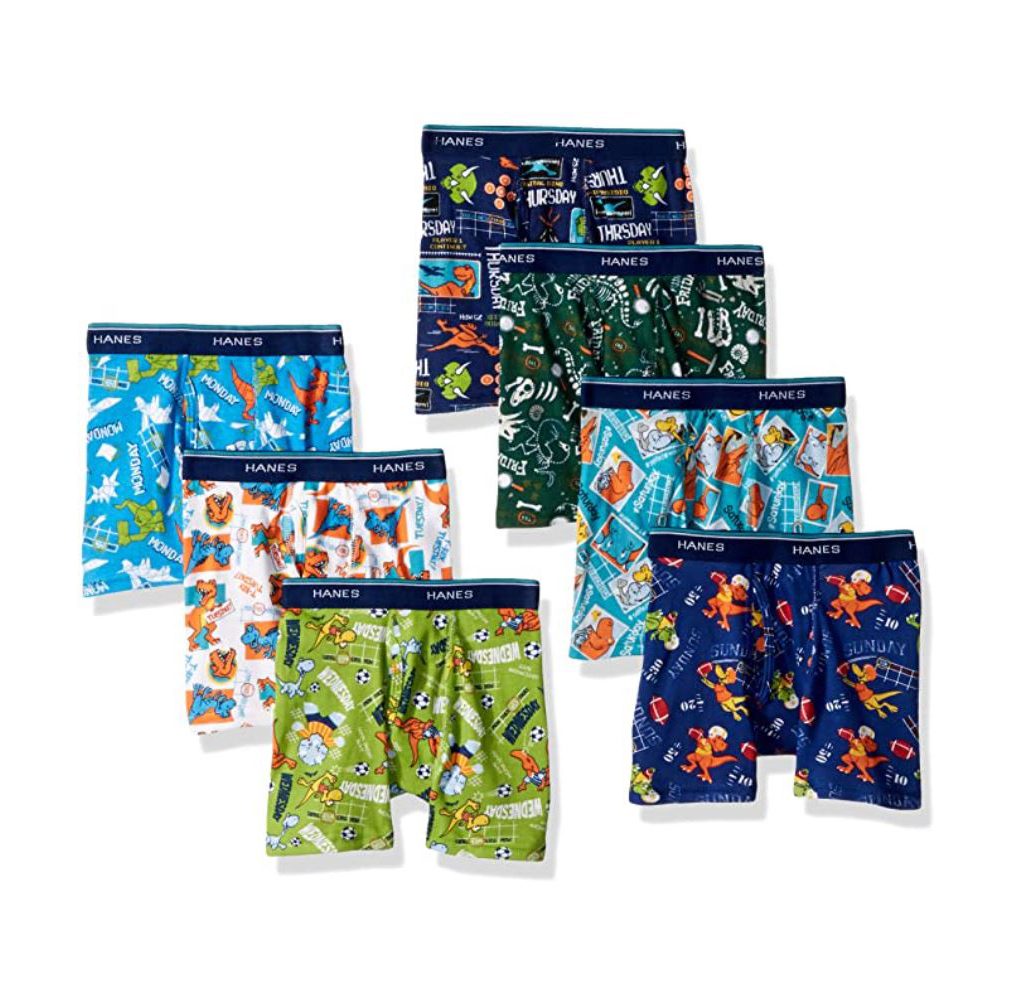 An educational set of underwear, the Hanes Boys Toddler Days of The Week Briefs each display an interesting print accompanied by a day of the week. These are an affordable first multipack of boxer briefs to buy your toddler.