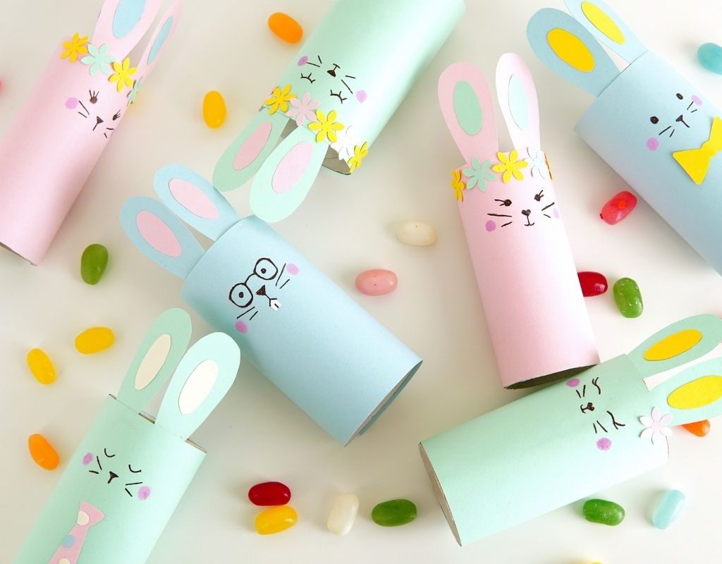 There are two ways to make these bunnies: Either paint a toilet paper roll or roll up a piece of colored construction paper and tape it to itself. Then, cut out and glue ears to the inside of the cylinder and draw a face on the outside. (Check out the inspiration in the picture above.)