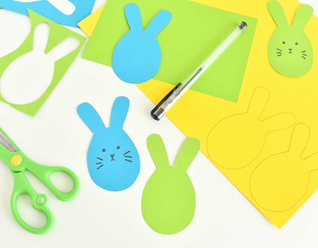 Cut out bunny faces (with ears, of course!) from colored construction paper and draw on the faces. Attach the faces with tape or clothespins to a string to hang up as a garland. You can make this as long as you want depending on how many bunnies your kids want to make and the size of the space that you’re decorating. Don’t have a long string around? Break out a roll of ribbon from the wrapping-paper drawer.
