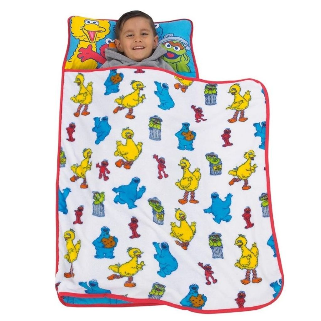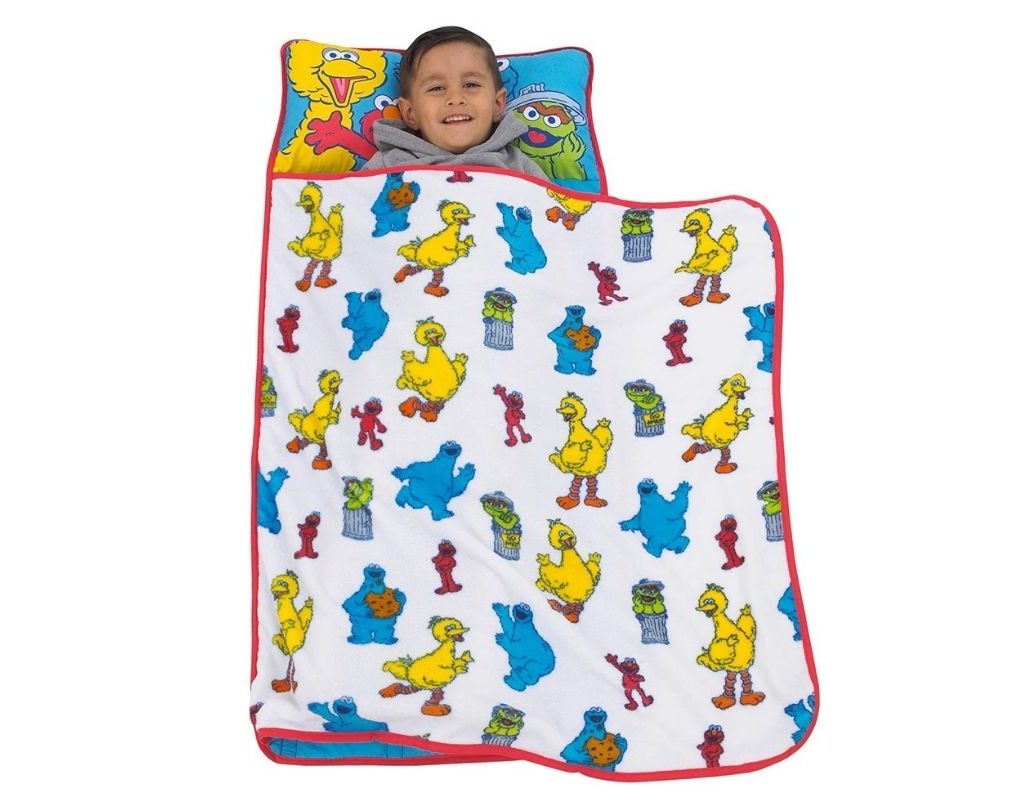 This quilted nap mat is fully machine-washable, rolls up to be carried, and has a design that lets your child tuck one side of the mat over them like a blanket with the other side being longer (46 inches) to reach under their head. Best of all, the mat features Elmo, Cookie Monster, Oscar the Grouch, and Big Bird. There is even a little tag where you can write a name after “This belongs to.”